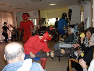 『鬼は外~!』鬼に扮した職員に大きな豆ボールを投げつけました。