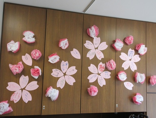 春の目標を花びら(画用紙)に書き込み、壁一面に桜の花で飾り付けをしました。